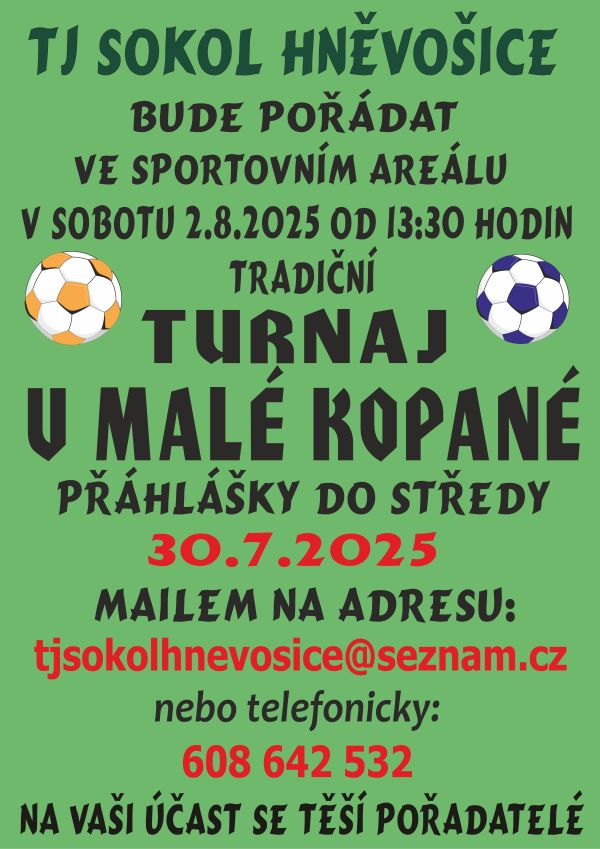 Na sobotu 8.8.2015 je na hřišti turnaj v malé kopané. Účastní se pět mužstev. Hrací systém 5 + 1. Hrát může každý, kdo má něco společného s Hněvošicema. ROZLOSOVÁNÍ S VÝSLEDKY TURNAJE - ZDE! |